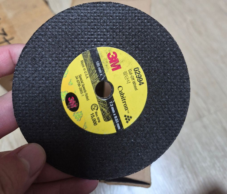 3M 큐피트론 절단석 02994 새제품입니다 노랑)3M 큐피트론 02994 절단석 정품이고 새제품입니다 1곽 50개 - 사이즈: 105mm x 1.3mm x 9.85mm 수량:142개(50개x2박스,42개) 하양)3M 4인치 연마석 절단석 그라인더날입니다. 수량:25개 총=167개 일괄구매시 할인 12만원드립니다
