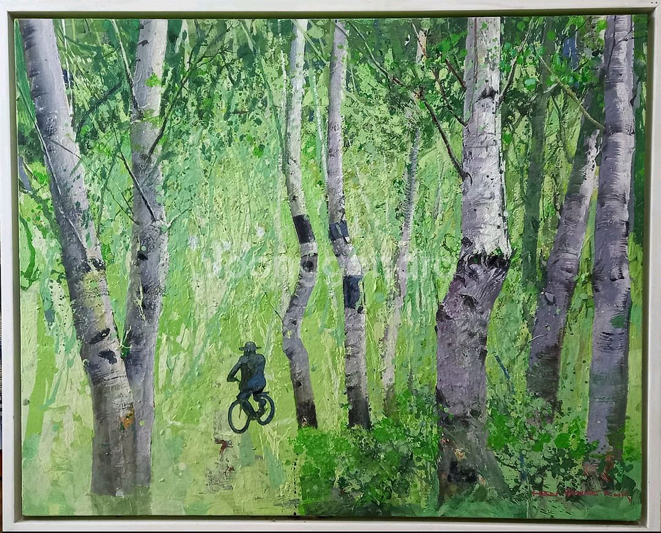 91×72cm(30호) 유화. 한병국, 2009 여름 방금 자른 싱그런 아침 오이냄새, 오월의 신부 치맛자락 향기가 풍기는 시베리아 바이칼호 자작나무숲에 들면, 문득 황홀하여 멀미를 느끼게 됩니다. 자작나무숲은 영혼의 나그네길입니다. 그해 5월 23일 노무현 대통령을 떠나보내며 홀연히 붓을 든 작가의 오마주. 논물 보러 가시는 우리네 아버지의 뒷모습으로도 보입니다. 어디든 잘 어울리고 걸어둔 곳을 해맑게 정화하는 치유의 그림입니다. 서재에 걸어둘만큼 애장해온 수작이죠. 올해는 제 서재에서 이 작품을 그만 떠나보내야겠습니다. 그분을 앙모하는 분이 소장하시는 게 맞습니다. 길섶에서 살짝 떠있는 느낌의 자전거 바퀴가 진혼의 오마주 비밀코드. 작가 한병국은 대한민국 국전 심사위원을 지내신 분으로 마티에르 감각이 일품입니다.