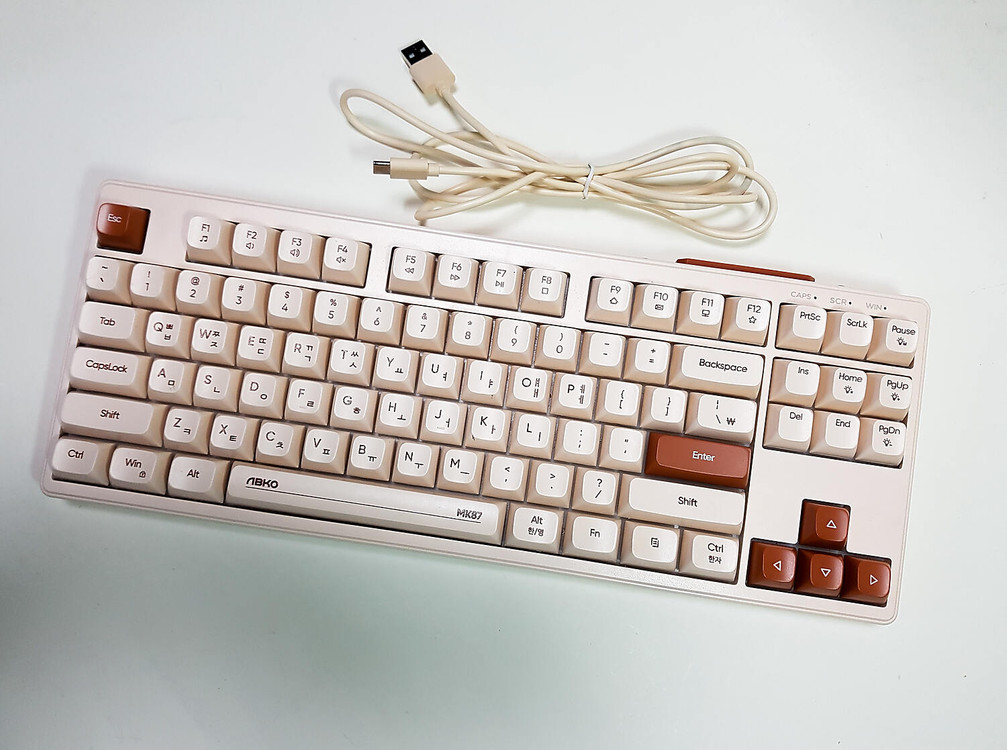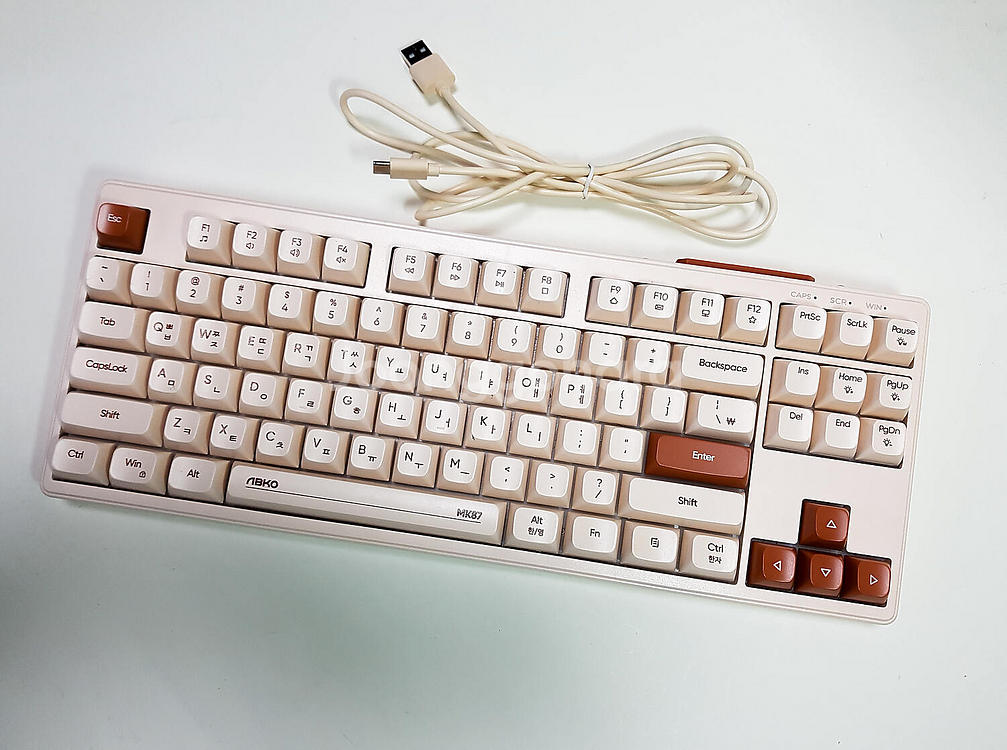 앱코 MK87 유선 키보드 오트밀 색상, 멤브레인 방식 사용감 별로 없이 깨끗한편입니다. 청소후 보관중이라 바로 사용하시면 됩니다. 구성품 - 키보드 본체, C타입 케이블