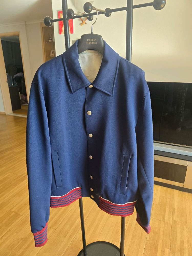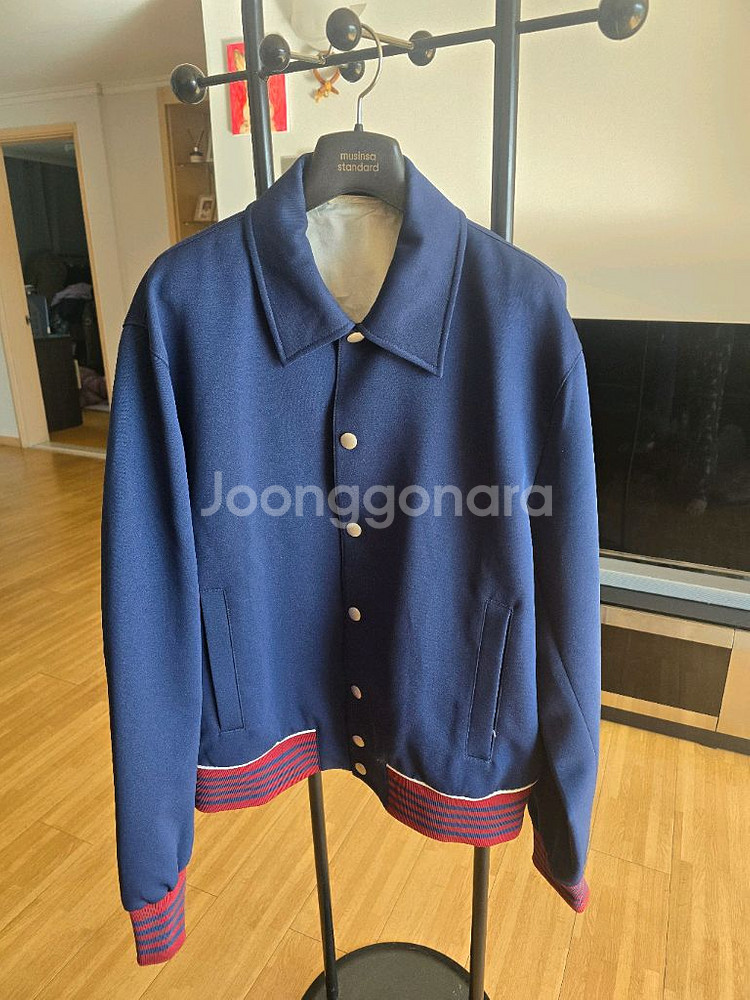 네이비 바시티 자켓이에요. 소매 밑단에 레드 스트라이프 디테일이 포인트로 들어가 있고, 골드 버튼이 고급스러워 보입니다. 상태 양호한 중고 제품으로 깔끔하게 관리되어 있어요.
