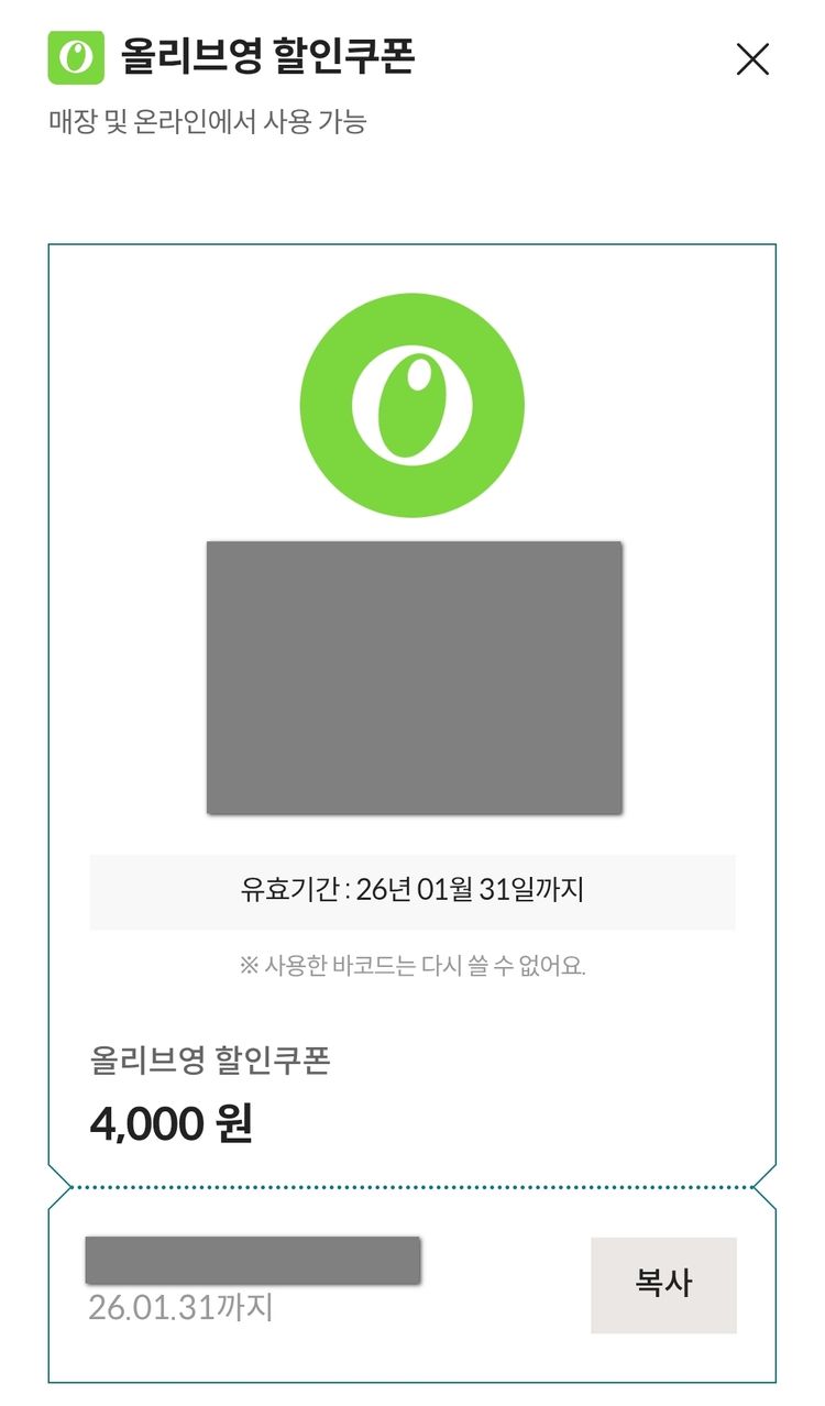 올리브영 4천 쿠폰 판매가: 1500원 유효기한: 01월 31일 꼭 알아두세요 전국 올리브영 매장(일부 매장 제외)과 앱, 모바일웹 페이지를 통한 구매 시 모바일상품권을 쓸 수 있어요. 올리브영 매장에서 결제 시 모바일상품권의 바코드나 쿠폰번호를 직원에게 보여주세요. 매장에서는 여러 개의 모바일상품권을 함께 사용할 수 있어요.(온라인몰은 한 번 결제할 때 한 개의 모바일상품권만 사용 가능) 쇼핑몰·백화점·KTX 역사 내 입점 매장 등 일부 매장과 셀프계산대에서는 모바일상품권을 사용할 수 없어요. 올리브영 온라인몰에서 사용하려면 '결제 > 모바일상품권 잔액 조회하기 > 모바일상품권 번호 입력 > 잔액 확인 > 결제하기'를 눌러 주세요. 모바일상품권은 표기된 금액 내에서 여러 번 나눠서 사용할 수 있어요. 모바일상품권 금액을 초과하는 경우에는 다른 결제수단과 함께 결제할 수 있어요. 기프트카드, 상품권 및 일부 상품은 모바일상품권으로 구매가 불가능해요. 모바일상품권은 유효기간 연장이나 환불이 되지 않으니 꼭 기간 내에 사용해주세요. 유효기간이 지난 후에는, 구매한 상품의 교환/반품 시 모바일상품권을 다시 쓸 수 없어요. 모바일교환권 사용금액만큼 CJ ONE 포인트 적립과 현금영수증 발행이 가능해요. 사용/환불 관련 궁금한 점은 기프티콘 고객센터(1800-0133)로 문의해주세요.