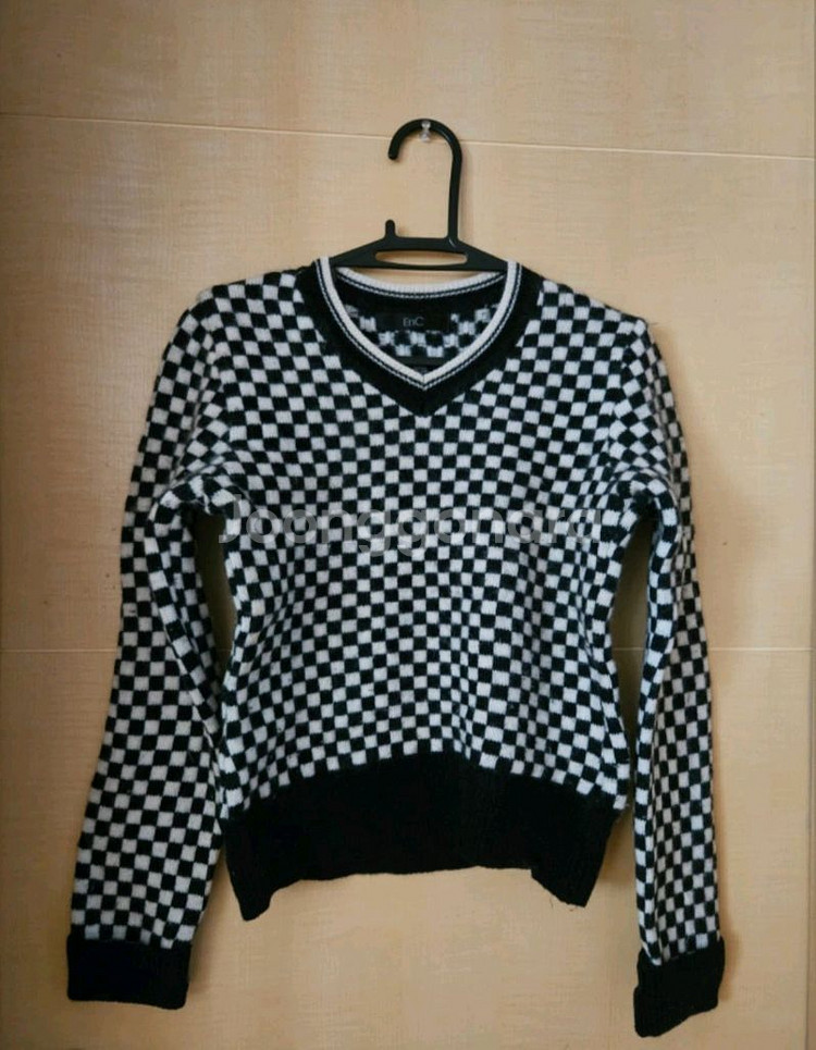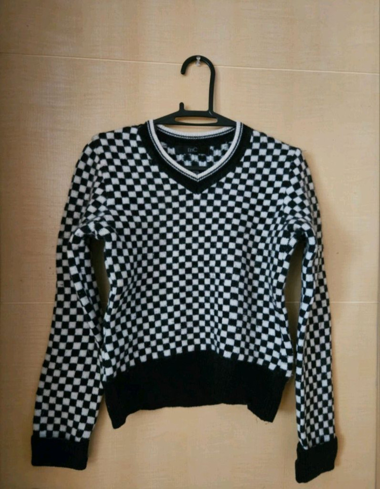 ENC 니트 스웨터 블랙&화이트 체커보드 패턴의 세련되고 포인트되는 스웨터예요. V넥 디자인에 블랙 트리밍으로 포인트를 준 깔끔한 스타일입니다. 44~55 결정되시고 매너거래로 하실분 찔러보기네고교환환불 x