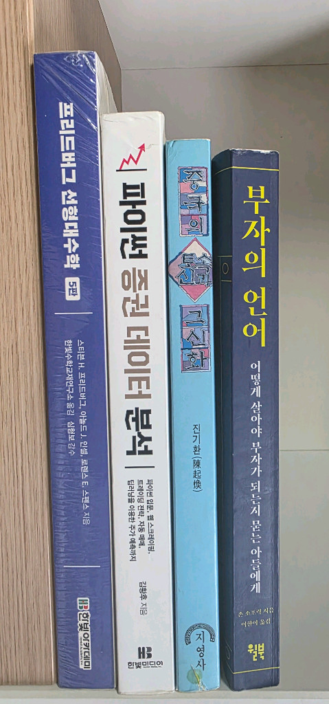 - 직거래가능(서울). OIO - 7IO4 - 32육4 로 문자 가능. 택배 가능 - 판매된 도서는 해당도서란 우측 끝에 - 판매완료 표시 프리드버그 선형대수학 5판/스티븐 H 프리드버그. 아놀드 J 인셀 외/한빛수학교재연구소/한빛아카데미/2020년판/비닐미개봉 새책/ - 판매완료 파이썬 증권 데이터 분석(파이썬 입문, 웹 스크레이핑, 트레이딩 전략, 자동 매매)/김황후/한빛미디어/2020년판/459P/최상급/ - 판매완료 중국의 토속신과 그 신화/진기환/지영사/1996년초판/361P/상급 - 밑줄메모없이 깨끗하고 단정/ 부자의 언어(어떻게 살아야 부자가 되는지 묻는 아들에게)/존 소포릭/이한이/윌북/2020년판/393P/상급 - 밑줄메모없이 깨끗하고 단정. 약간 휨 있음/ - 판매완료 ■당쟁으로 보는 조선역사. 사화로 보는 조선역사 총 2권/15000원 - 당쟁으로 보는 조선역사(석필. 테마 역사읽기 1)/이덕일/석필/2004년판/478P/상급 - 밑줄메모없이 깨끗하고 단정/ - 사화로 보는 조선역사(석필. 테마 역사읽기 2)/이덕일/석필/2005년판/447P/상급 - 밑줄메모없이 깨끗하고 단정/ 조정래 태백산맥 10권 완결/조정래/1993.4년 제1판/상급은 아니나 상급에 가깝고 밑줄메모없이 깨끗하고 단정. 변색은 보통/35000원 2024 해커스공무원 정윤돈 회계학 재무회계 기본서/정윤돈/해커스공무원/2023.7.3일 개정3판1쇄/796P/총 5페이지만 볼펜밑줄메모 있고 공부하시는데는지장없음. 그외 책상태는 전체적으로 거의 최상급수준으로 아주단정/상태감안 15000원 2024 해커스공무원 이훈엽 지방세법 기본서/이훈엽/해커스공무원/2023.7.3일 개정3판1쇄/455P/최상급/ - 판매완료 2024 아무도 알려주지 않는 건축품셈 강의노트(공정별 표준품셈 원문수록)/안요환/기문당/2024.1.30일초판/541P/거의새책/ - 판매완료 개정 건설업 실질자본금 실무해설(건설업관리규정 및 건설업체 기업진단지침)/이종헌(태성회계법인 공인회계사)/건설경제/2017.11.16일초판/308P/최상급/1만원 365 Days of Creativity(Inspire Your Imagination with Art Every Day). 영어원서/로나 스코비 그림/Hardie Grant Books/2019년 9월 19일 발행/366P/최상급/15000원 하나님의 열심(믿음은 어디서 오는가)/박영선/무근검(남포교회출판부)/2019.7.23일 초판5쇄/412P/상급 - 밑줄메모없이 깨끗하고 단정/ - 판매완료