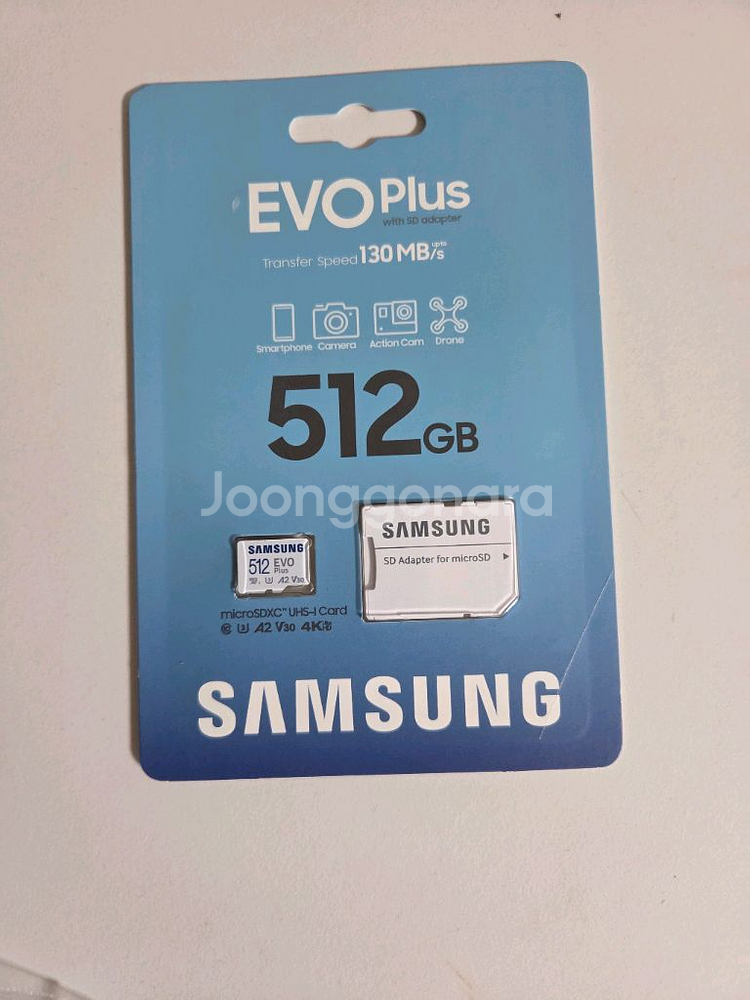 정품 마이크로SD카드 512GB입니다. 패키지 상태 양호하고 정상 작동 확인했어요. 스마트폰이나 카메라 용량 확장용으로 좋습니다.