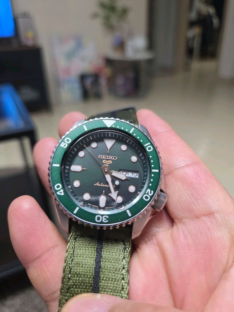 그린 베젤 다이버 시계입니다. 실버 케이스에 그린 브레이슬릿으로 스포티한 느낌이 좋아요. 전체적으로 깔끔한 상태로 보관되어 있습니다. 구입후 사용빈도는 많지않구요. 깨끗합니다. 브슬은 좀 아니라 나토밴드로 교체했습니다. 박스 등 있습니다. 을지로4가역, 삼송역 근처에서 직거래 가능합니다.