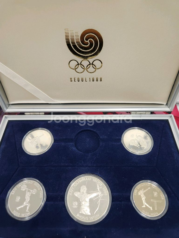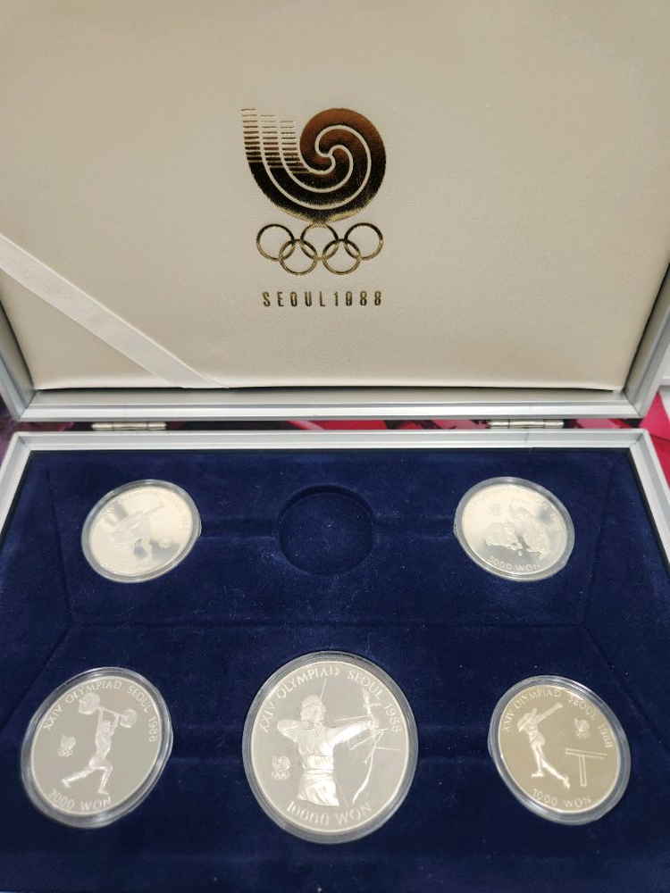 안녕하세요, 1988 서울 올림픽 기념 4차 기념주화 금화 빠진 5개 세트 판매합니다. 1만원 x1종 은화 5천원 x2종 은화 2천원 x1종 니켈 1천원 x1종 구리/니켈 미사용 상품입니다. 외부종이 아웃케이스및 내부 알루미늄전용 케이스와 보증서가 함께 있어서 컬렉션용으로도 좋습니다. 상태는 양호합니다. 직거래 우선으로 합니다. 수원 고색역 주변에서 가능하고, 택배거래 원하시면 택배비 4천원추가해주시면 발송가능합니다. 채팅연락주시면 감사하겠습니다.