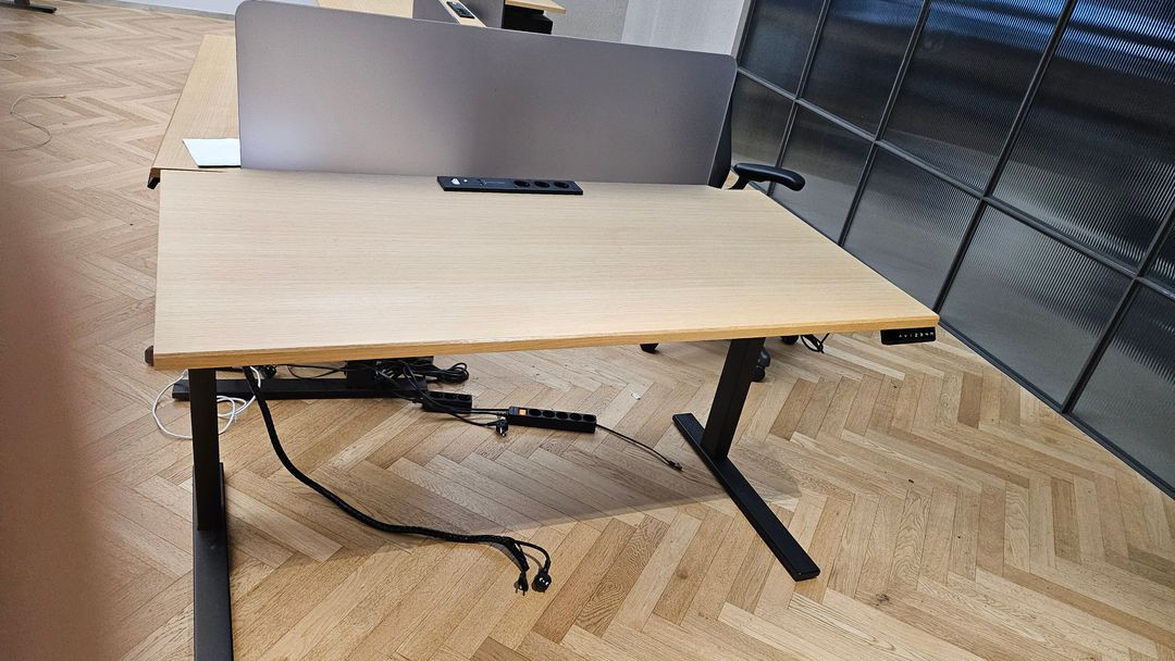 높이 조절이 가능한 전동 책상이에요. 사용감은 있지만 기능에는 문제없이 잘 작동합니다. 실용적이고 깔끔한 디자인으로 홈오피스나 학습용으로 좋아요.칸막이별도 입니다