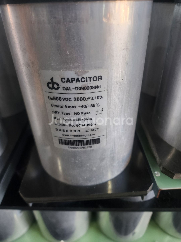 DAL‑D Series DC Link Capacitor, 모델 DAL‑D090208Nd. 정격 전압: 900 VDC, 정전용량 2000 µF, 허용오차 ±10%. 사용 온도 범위: 약 ‑40 ℃ ~ +85 ℃로 표시. 구조: 원통형 알루미늄 케이스, 건식(DRY type), 내부 메탈라이즈드 폴리프로필렌 필름 사용. 특징 대용량: 수천 µF급까지 구현되는 대용량 DC 링크 전용 필름커패시터. 고서지·고리플 대응: 고서지 전압, 높은 리플전류와 피크전류를 견디도록 설계된 메탈라이즈드 필름 사용. 건식 구조: 비유전유(oil-free) 건식 구조로 누유 위험이 없고 유지보수가 용이함. 알루미늄 케이스: 원통형 알루미늄 케이스와 볼트 체결 단자를 사용해 기계적 강도가 높고 설치가 간편함. 장점 수명과 신뢰성: 폴리프로필렌 필름 DC 링크 커패시터는 ESR이 낮고 발열이 적어 장시간 운전에서도 수명이 길다. 고전압·고전류 적용 가능: 900VDC 정격과 높은 리플허용으로 대형 인버터, UPS 등 고전력 장비에 적합하다. 저손실 특성: 낮은 손실계수(tanδ)로 에너지 효율이 높고 시스템 효율 향상에 기여한다. 주요 사용처 DAL‑D 시리즈 전체의 대표 용도는 다음과 같다. 인버터 DC 링크 회로: 태양광·풍력 발전 인버터, 모터 드라이브, 고주파 인버터 등 DC 링크 평활용. ESS·UPS: 에너지저장장치, 무정전전원장치의 충·방전 DC 버스 평활 및 필터용. 일반 고전력 DC 전원: 대형 정류기, 고전압 전원장치, 산업용 전력변환기 교환,환불 불가 착불입니다.