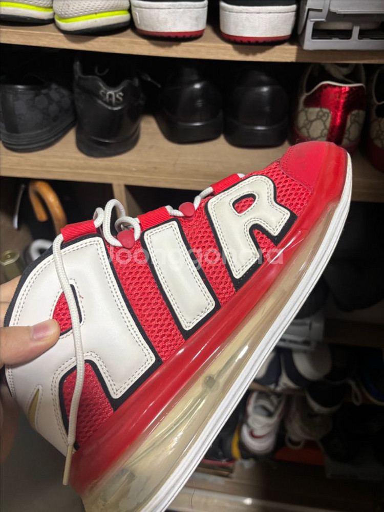 나이키 에어 모어 업템포 720 레드/화이트 색상입니다. 사이즈는 275mm이고, 밑창에 사용감이 있습니다 가격협의가능