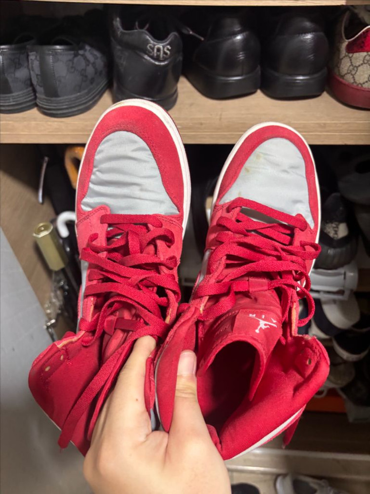 나이키 에어 조던 1 스트로베리 앤 크림 빨간색, 회색 스니커즈입니다. 사이즈는 280mm입니다. 밑창과 전체적으로 사용감이 있습니다