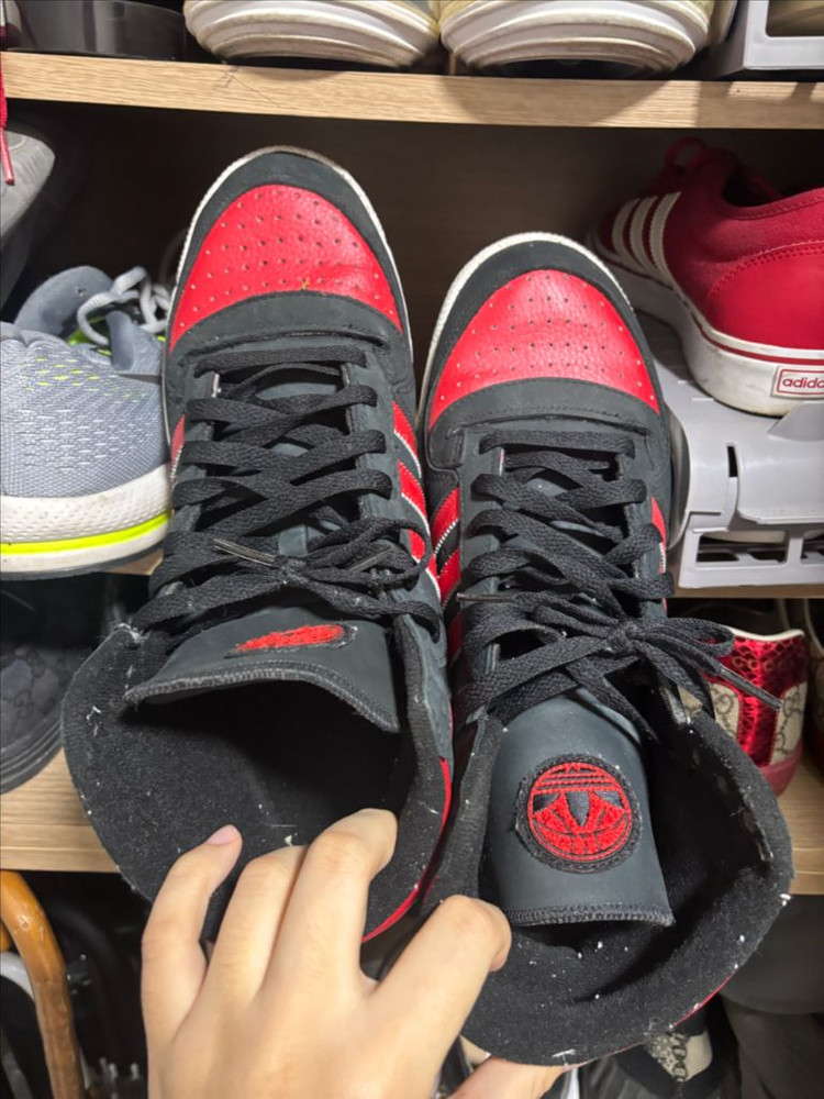 아디다스 탑텐 하이 스니커즈 280mm 사이즈입니다. 블랙과 레드 색상 조합이 멋스러워요. 전체적으로 사용감은 있지만, 편하게 신으실 분에게 추천드려요~ 가격협의가능