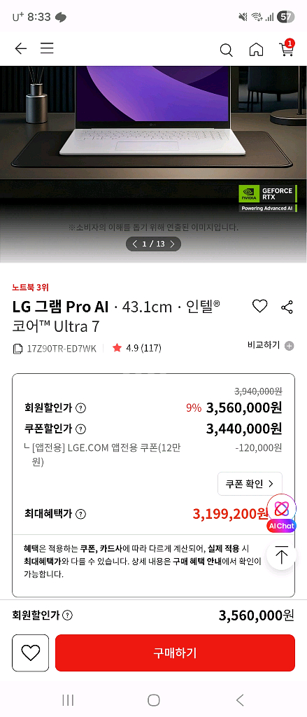 LG 그램 Pro 17인치 노트북 판매합니다 2025년 8월출시 제품 - 모델명: 17Z90TR-ED7WK - 색상: 화이트 - 윈도우 11 Home - 인텔 울트라7-255H 프로세서 - 32GB 램 - 1TB SSD - RTX 5050 GDDR7 8GB 그래픽 - 1.479kg의 무게로 휴대성이 좋습니다 - 배터리 90wh로 하위모델 77wh보다 큽니다 - 얇은 베젤로 몰입감 있는 화면을 제공합니다 - 구성품 전체 17인치인데도 엄청 가볍습니다 방금 개봉했습니다 개봉과 동시에 고급 AR보호필름 5만원주고 전문점장착 외부보호필름 4만원 장착 사은품인 어도비 그램챗클라우드 쿠폰 같이 드려요 2026년 1월 22일 공식홈 구매 오늘 뜯어서 사양 확인했습니다 신품 할인받아도 320 입니다 터치가 필요해서 기변합니다