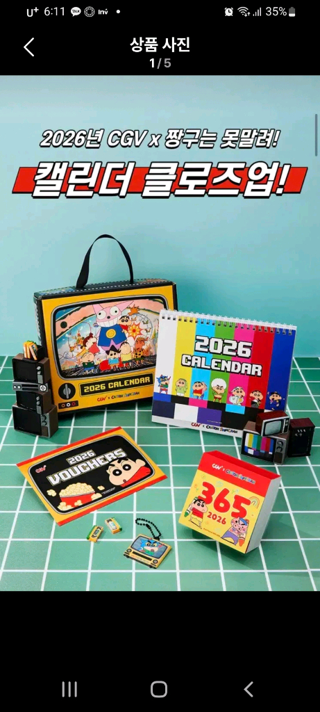 안녕하세요~ cgv 짱구 캘린더세트에서 쿠폰만 뺐어요. 구성품은 캘린더, 365 메모지, NFC 키링 이예요. 좋은 하루되세요~