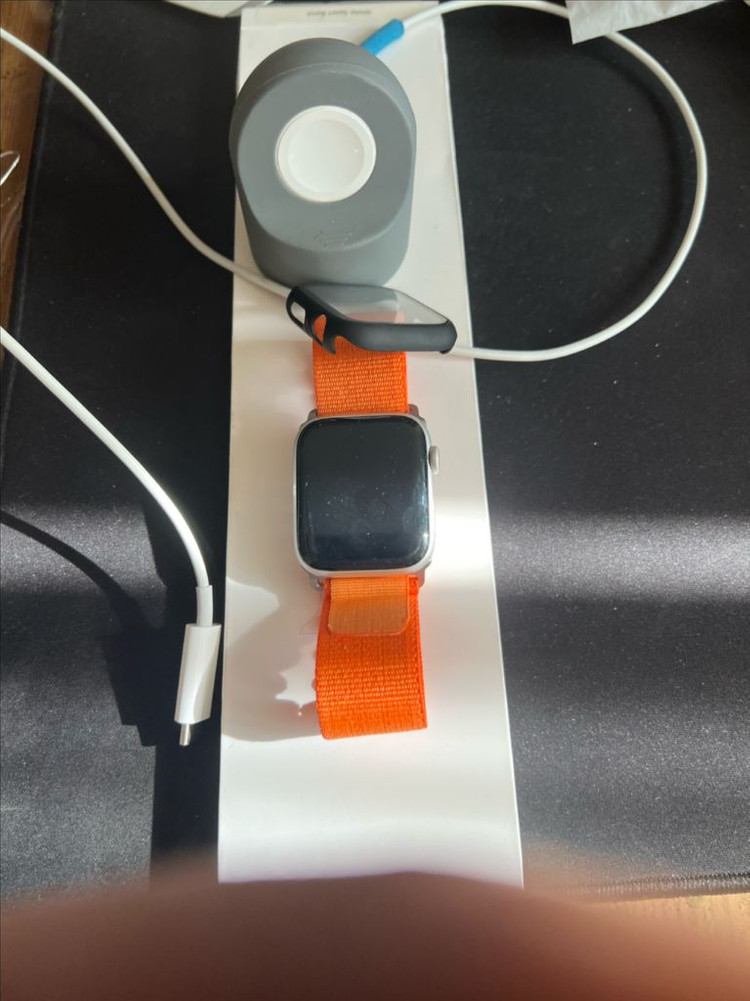 정품 충전기를 힐링쉴드 실리콘 거치대에 끼워두었습니다. 외부매장에서 구매한 케이스를 끼고 조심히 사용하여 배터리 효율 이외에 문제 사항은 없습니다. 구매 시 - 애플워치 se2 스타라이트 본품 (배터리 효율 87%) - 정품 화이트 스트랩 (+25000) - 오랜지 스트랩 - 정품 충전기 c타입 (+12000) - 힐링쉴드 충전 거치대(+2000) - 보호 케이스 구성입니다.