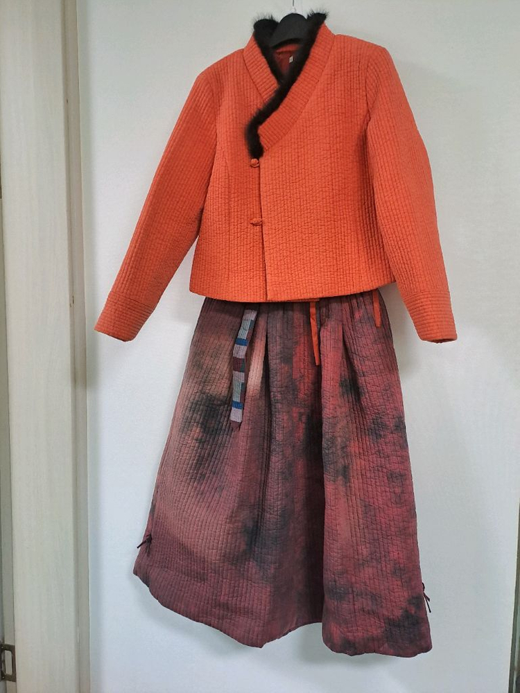 오렌지색 한복 자켓과 버건디 치마로 구성된 세트예요. 목 부분에 블랙 퍼 트리밍이 있어서 고급스러운 느낌이 나고, 전체적으로 상태가 양호해 보입니다.