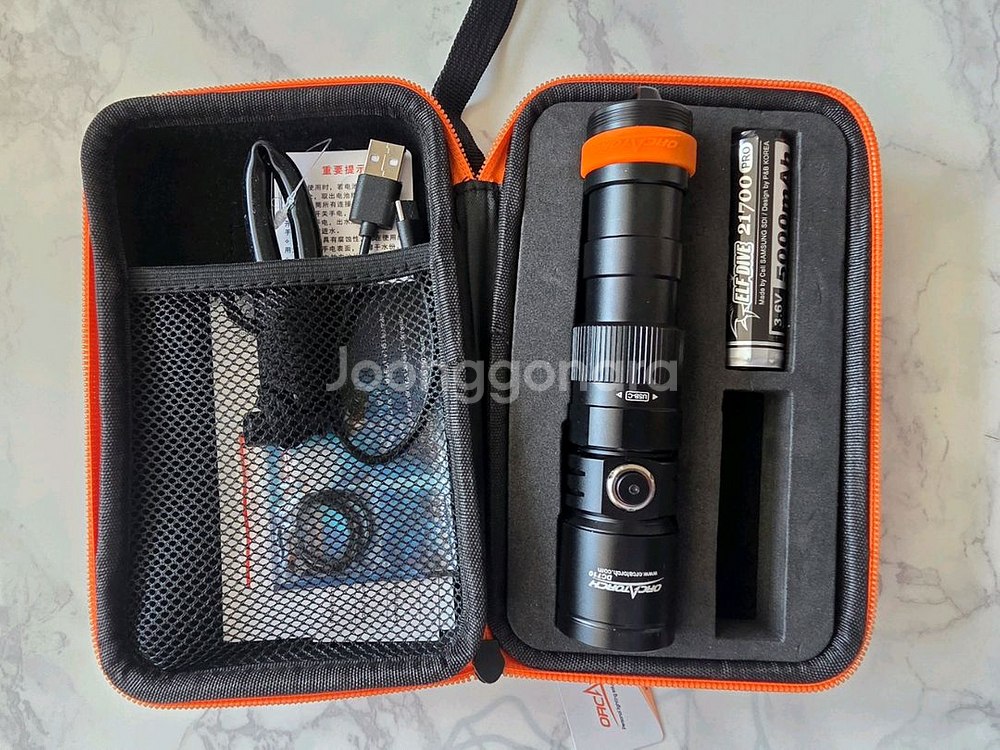 개인정보(거래정보)를 주고받는 행위는 사기에 노출될 수 있으므로 즉시 중고나라로 신고해 주세요Orcatorch DC710 다이빙랜턴 해루질랜턴 수중랜턴 고출력 21700 5000mAh 충전지 충전케이블 손목스트랩 여분O링 보증서 설명서 보관파우치 포함 풀박스 미사용 새상품