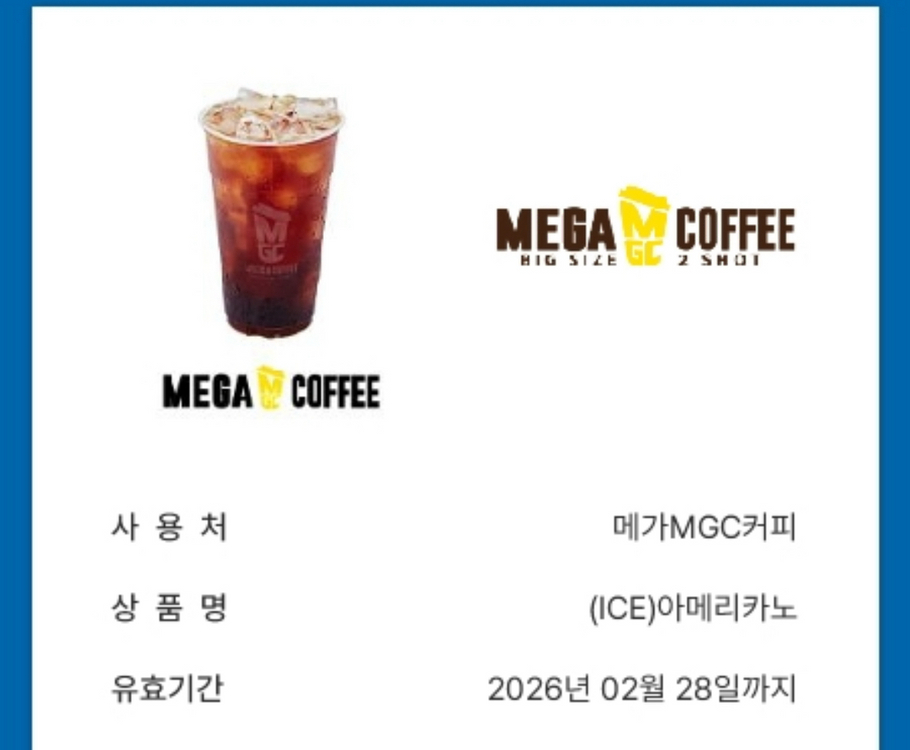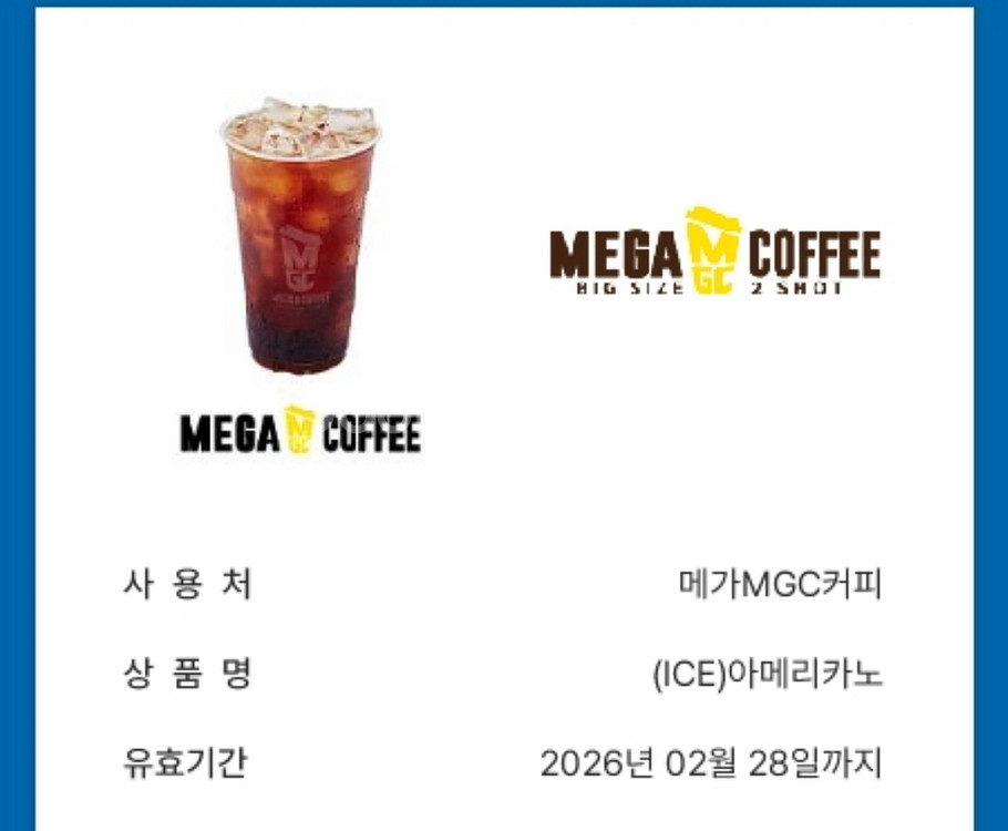 커피전문점에서 제공하는 아메리카노 아이스입니다. 사용처는 메가MGC커피이고 유효기간은 2026년 2월 28일까지예요. 2장 일괄 3천원입니다 안심결제는 3040원입니다 쿠폰 받고 바로 구매확정 조건으로만 안심결제 가능합니다