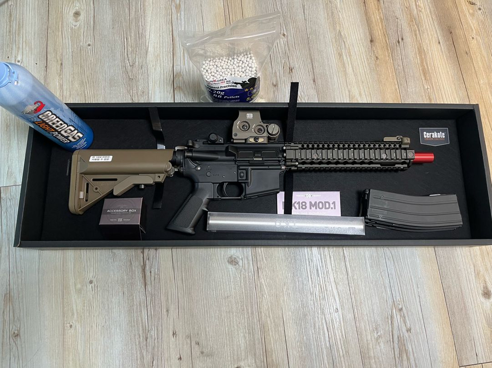 25년 4월 22일 구매 mk18 mod 1 gbb (tko 바렐넛포함) 구성품 모두 보유중이며, tko 레일 바렐넛 분해툴 포함입니다 mws 탄창 두개입니다 홀리워리어 S1 이오텍 조준경 포함 사진에 보이시는것 모두 포함입니다 처음 집에서 200발 정도 쏴보고 쭉 보관중입니다 (거의 새것) 총 구매가 110만원 정도 공주시 반포면 직거래만 직접 오셔야 합니다