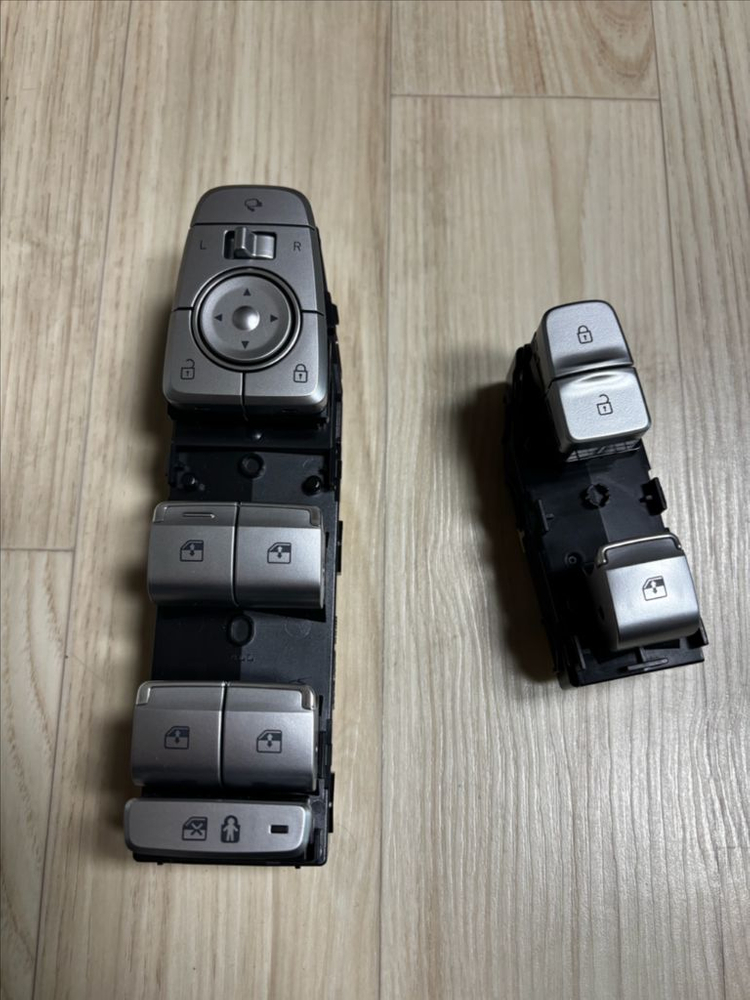 더뉴그랜저 캘리그라피 도어 스위치 2개 세트입니다. 운전석은 박스 포장 상태로 새 제품이며, 조수석은 중고 제품이나 문제 없이 작동 잘 합니다. 기판 교환 하시거나 필요하신 분은 연락주세여