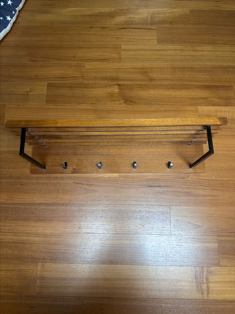 데니쉬 원목 벽걸이 선반입니다. 가로 75cm, 세로 26.5cm 사이즈로, 상단 선반과 하단 4개의 후크가 있어 수납과 옷걸이 기능을 동시에 할 수 있어요. 사용감은 있지만 전체적으로 깔끔한 상태입니다. 현관이나 방에 걸어두고 사용하기 좋습니다.