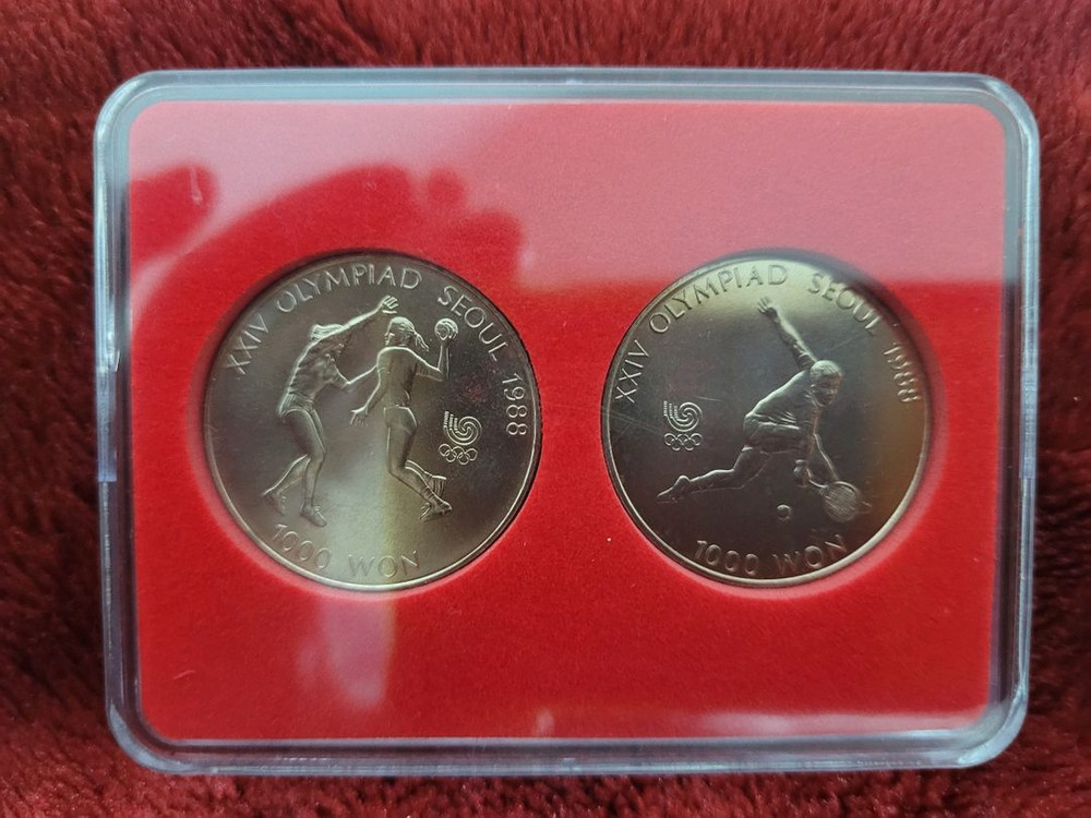 1988년 서울 올림픽을 기념하여 발행된 1000원 기념주화 2종 세트입니다 테니스와 핸드볼 디자인이 각각 새겨져 있으며, 1987년에 발행된 주화입니다 케이스에 보관되어 있어 상태가 매우 깨끗하고 미사용으로 보입니다 수집 가치가 있는 기념주화로 소장하시기 좋습니다