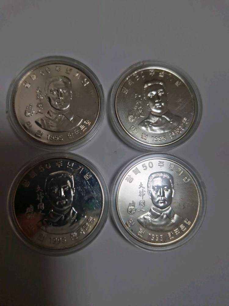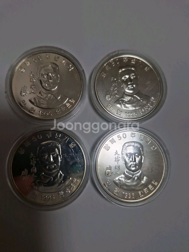 기념주화 광복 50주년(안중근, 만원권) (은화, 은90%)기념주화 4개와 5000원권(김구, 백동화 16g) 5개, 1000원권(UN50주년, 백동화) 5개입니다. *개별 금액이 있습니다. 아래금액 참고해주세요. - 안중근(만원권, 은화) 개당 16만원 - 김구(5000원권, 백동화 16g) 개당 4만원 - UN 50주년(1000원권, 백동화) 개당 6000원 각각 전용 케이스에 보관되어 있고 상태가 양호해요. 수집용이나 소장용으로 좋을 것 같습니다.