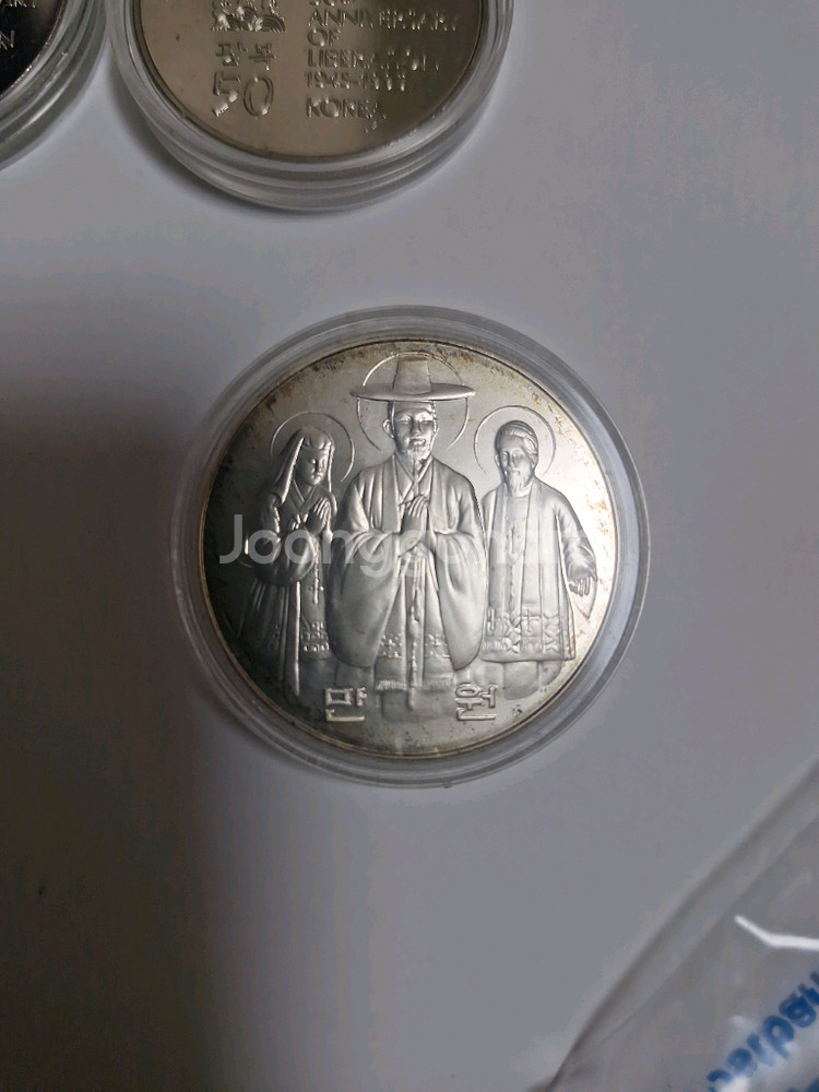 천주교전래 200주년을 기념하는 주화입니다. 1984년5월1일 발행. 10,000원화는 김대건 신부, 범 로렌조 주교, 박루시아를 도안으로 하고 뒷면에 십자가를 넣었습니다. 10,000원화는 은 50%·구리 50%, 직경 36mm, 무게 23.3g입니다. 1000원주화(명동성당) 4개도 있습니다. 42년가까이 되며 흔적이 조금 있습니다. 천주교 다니시는 분들께 특별한 선물로 드리거나 수집가치가 있습니다. 택배비별도
