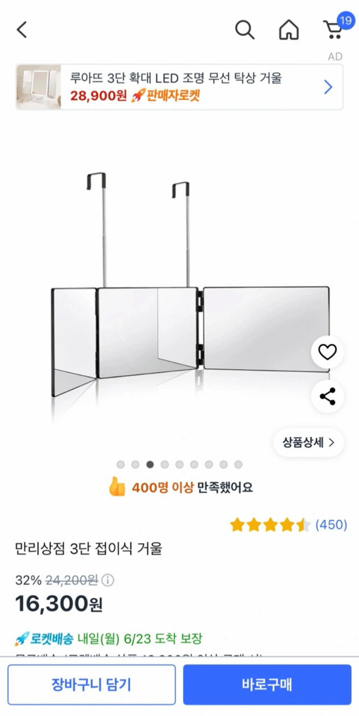 머리 뒤쪽 볼때 너무 좋아요. 목덜미 면도도 좋고 3단으로 접히는 삼면 거울입니다 문이나 옷장 등에 걸어서 사용할 수 있어요 색상은 블랙이고 미개봉입니다. 쿠팡에서 2개 주문하고 하나는 사용 중인데 하나는 반납 기간을 놓쳐서 내놓습니다 쿠팡 링크는 아래. 만리상점 3단 접이식 거울 https://link.coupang.com/a/cACRXn 세븐일레븐 차한 택배로 하시면 1400원만 추가하시면 보내드립니다.