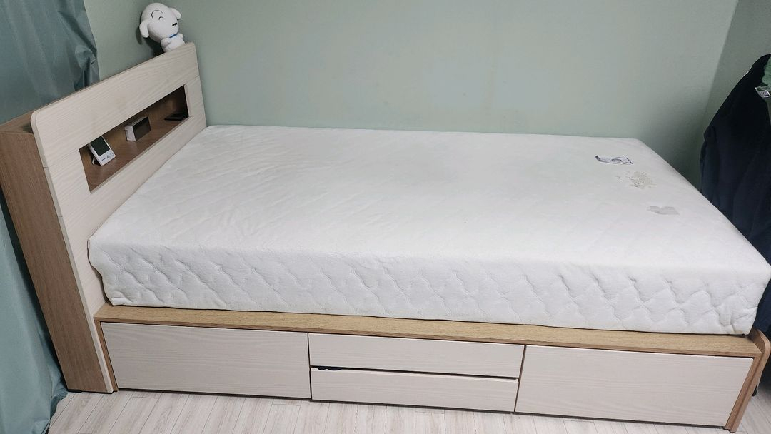 슈퍼싱글 서랍형 침대 프레임 판매합니다. 1년정도 사용 깨끗하고 수납공간이 넉넉해서 유용해요 매트리스도 필요하시면 드려요.