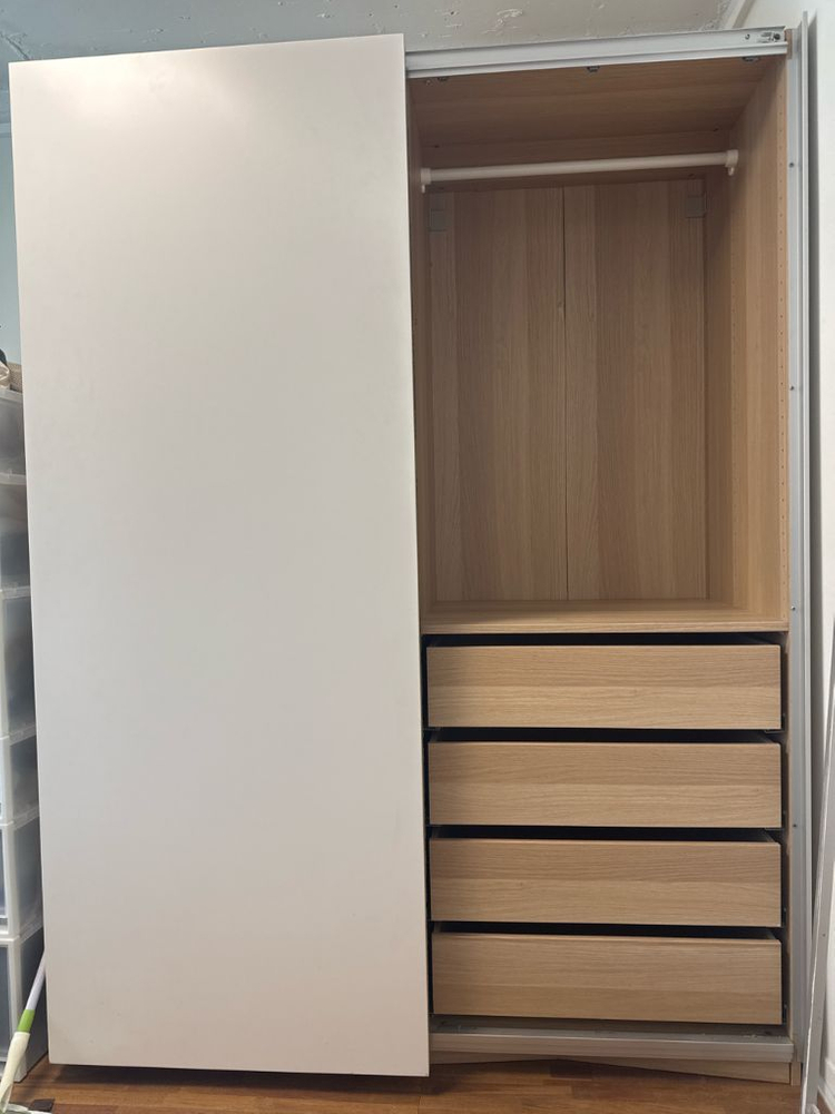 이케아 팍스 슬라이딩 옷장 서랍 4개 구성 슬라이딩이라 문짝 분리후 통으로 옮겨야합니다. 엘베 없는 1.5층 용달 부르셔서 바로 가져가실분만 연락주세요 용달 먼저 예약하신 분께 드립니다. 가로 160(문짝하나가 80) x 세로 200 원래 나무색인데 옷장 한 면은 벤자민 무어 흰색으로 칠해져있어요. 한쪽은 옷걸이 봉 2 단, 선반으로 구성되어 있고, 다른 한쪽은 옷걸이 봉1 단, 서랍으로 되어 있어 수납 활용도가 높습니다 사진 잘 확인하시고 청와대앞 거래.