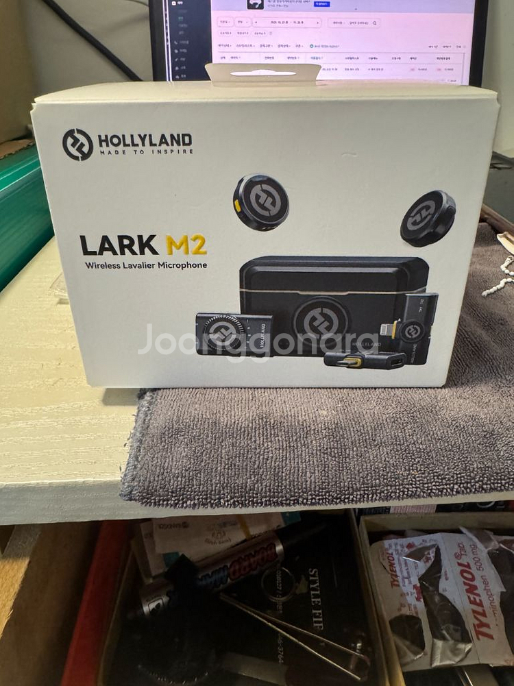 무선 라벨러 마이크 세트입니다. 박스 상태가 깨끗하고 새 제품 같아 보여요. 무선 방송이나 녹음용으로 사용하기 좋을 것 같습니다.