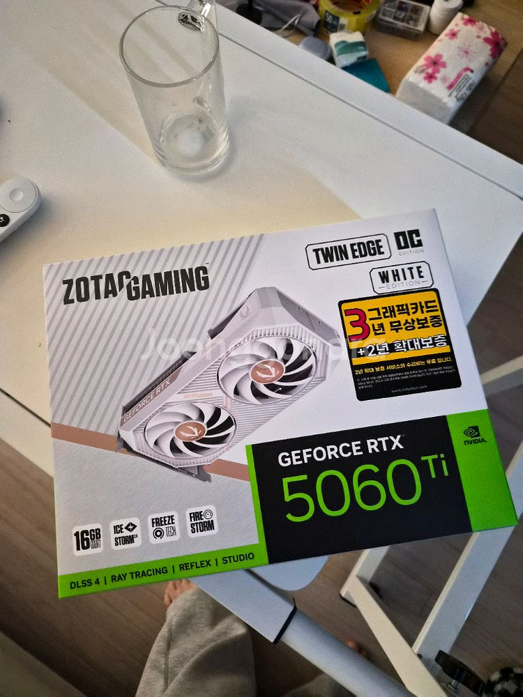 GeForce RTX 5060 Ti 16gb 화이트 그래픽카드입니다. 박스 상태로 보관되어 있어요. 게이밍용으로 사용하기 좋은 제품입니다.