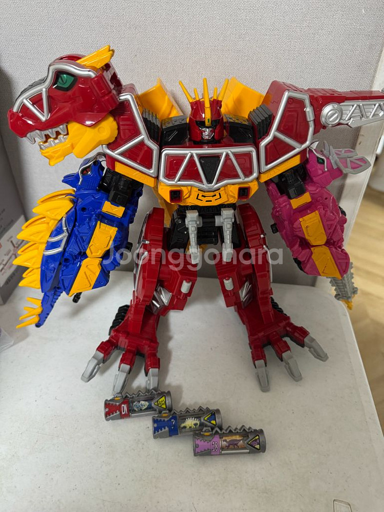 파워레인저 다이노포스 티라노킹 입니다. 음성 잘 나옵니다. (동영상 첨부) 파손 없고 변신 합체 잘 됩니다. 셀은 3개고 (1,3,5번 셀 대신 다른 셀 포함), 분홍색 공룡 작은 뿔이 없습니다.