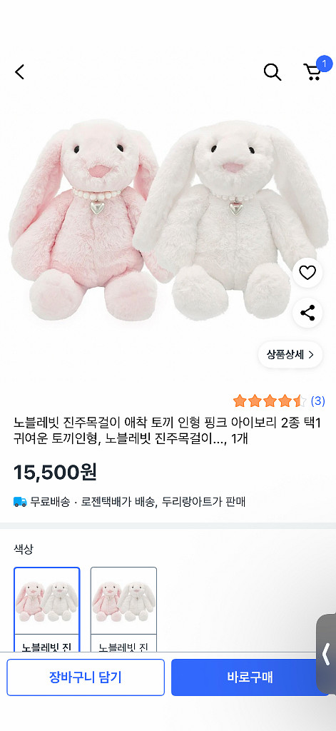 보들보들한 털 재질의 토끼 인형입니다. 은색팬던트와 진주 목걸이가 포인트입니다. 택 달린 새상품이니, 선물용으로도 좋을 것 같아요! 총길이 37cm정도입니다