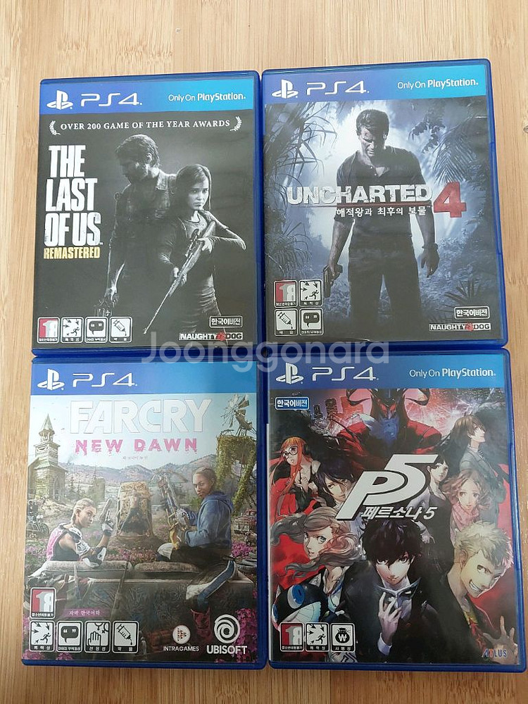 인기 PS4 게임 4개를 일괄 판매해요. 더 라스트 오브 어스 리마스터드, 언차티드 4, 파크라이 뉴던, P5 페르소나 5 입니다. 케이스 상태 양호하고 디스크도 깨끗한 편이에요. 일괄로 3.5만원에 팝니다~~ 택배비 발생시는 착불 또는 선결제
