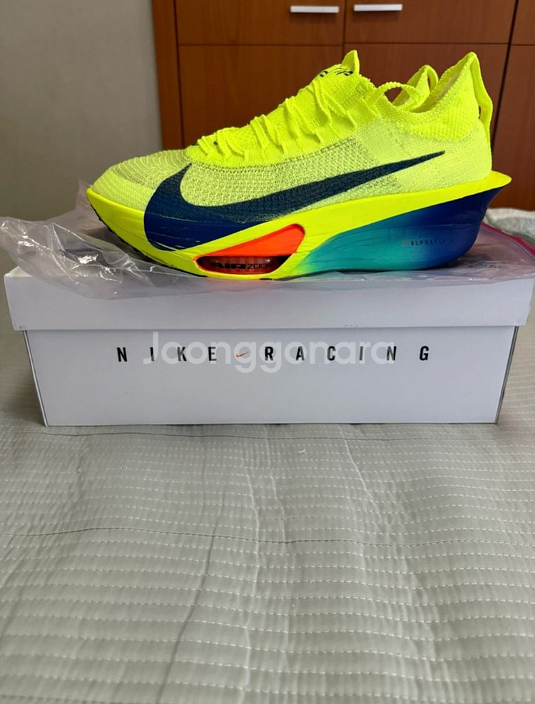 나이키 에어 줌 알파플라이 넥스트% 3 볼트 285mm 판매합니다. 형광 노란색이 눈에 띄는 레이싱화입니다. 박스 풀셋 이며 3km 1회 착용한 거의 새상품입니다 사진보시다시피 상태 정말좋구요 나코탭까지 풀구성입니다 - 사이즈: 285mm (US 10.5) - 박스, 더스트백 포함 직거래:4호선 범계역뷰근 범계성당앞 택배시:착붊및 선불(+5000) 이중포장