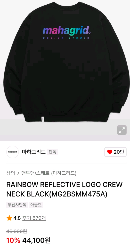 마하그리드 레인보우 리플렉티브 로고 맨투맨 블랙 색상입니다 - 면 60%, 폴리에스터 40% 재질로 제작되었습니다 - 빛을 받으면 반사되는 리플렉티브 로고가 포인트입니다 -안감 기모이구요. -라지사이즈 입니다. 작년구매 몇번 입지 않아 상태 새것 같아요. 반값택배비 포함 가격이에요.
