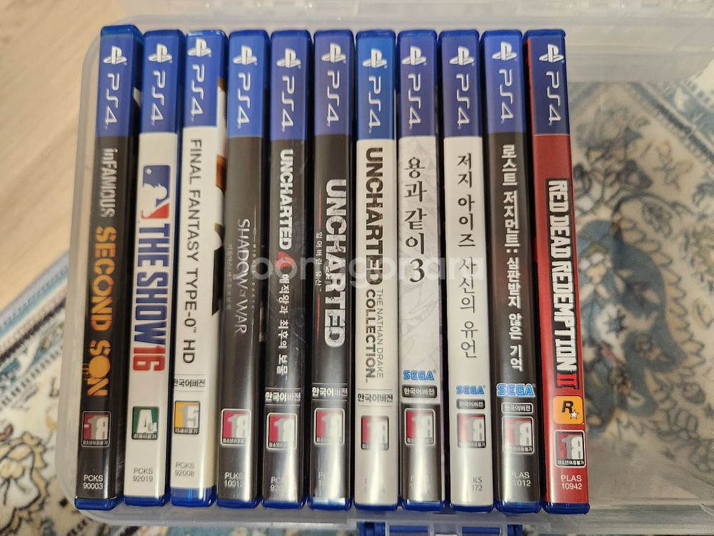 개인정보(거래정보)를 주고받는 행위는 사기에 노출될 수 있으므로 즉시 중고나라로 신고해 주세요 PS4 게임 11장 일괄 판매해요! 언차티드 시리즈, 용과같이, 레드 데드 리뎀션 등 다양한 타이틀들이 포함되어 있습니다. 케이스 상태 양호하고 디스크도 깨끗한 편이에요. 사진 참고하세요. 일괄 구매시 택배포함 10만원에 보내드립니다.