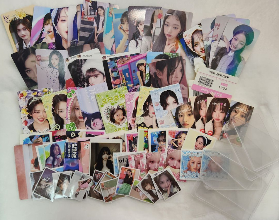 아이브 비공식 굿즈 포카 판매합니다~ 이쁜것들 많고요 종류 다양해서 멤버들의 여러모습이 담겨있습니다!! 사진에 보이는 포카 외에 다른 덤도 챙겨드려요~ 문의 없으시면 바로 안전결제해주시면 됩니다! 사진에보이는 사용하던 탑로더도 같이들려요~