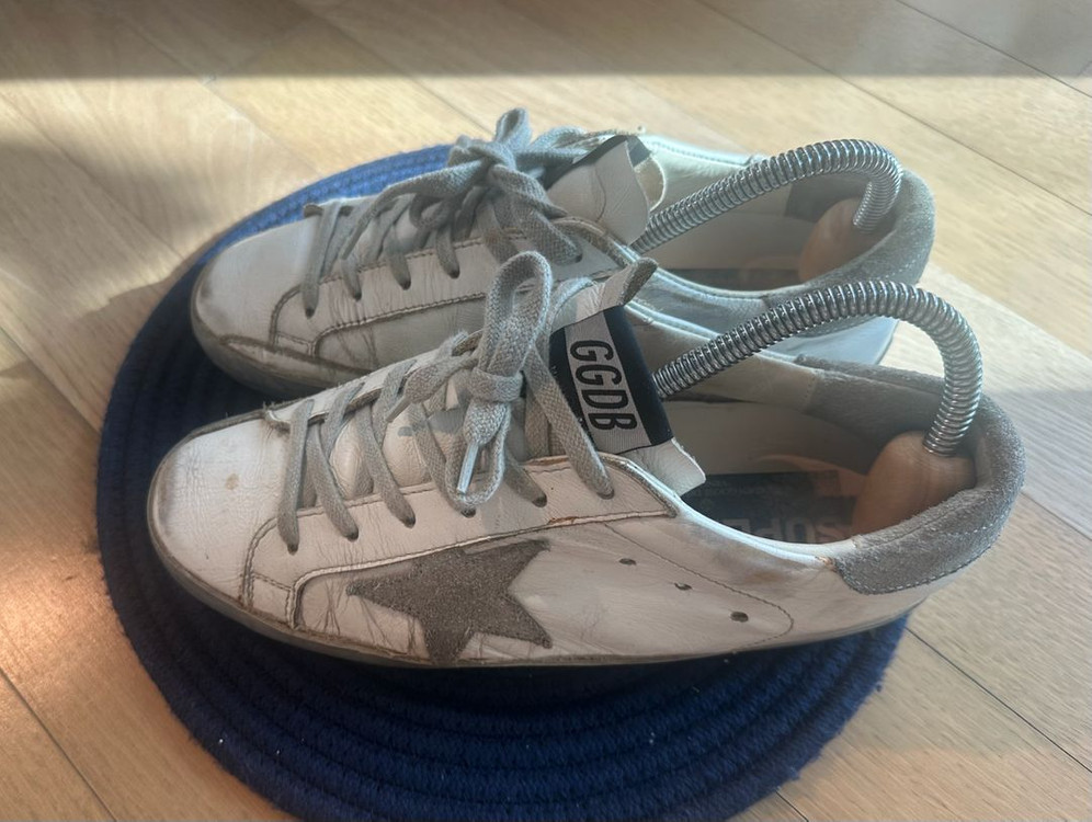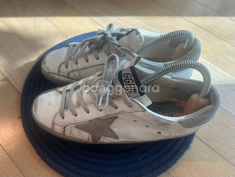 모델명 : 골든구스 슈퍼스타 화이트 실버탭 스니커즈 Golden Goose Superstar White Silver Heel Tab Sneakers 모델번호 : GMF00101-F000314-80185/GCOMS590-E36 사이즈 : 240(37) 구성품 : 신발 단품 평소 240 신는 저에게 잘맞습니다. 사용감 있으나, 가죽크림, 바닥슈구까지 해놔서 신발 바닥은 닳아지지 않았어요. 사진의 상태 감안해서 참고하시고 가져가셔요.