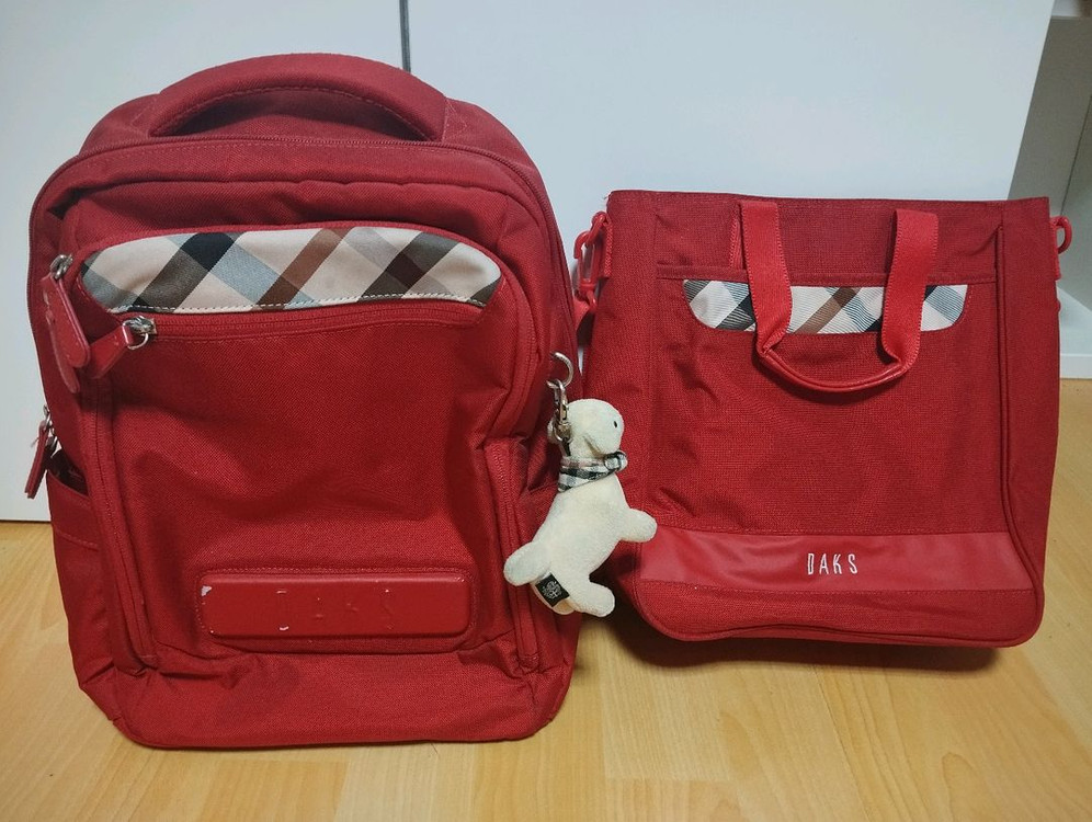 아동용 레드 컬러 백팩과 보조가방 세트예요. 체크 패턴 포인트와 귀여운 동물 키링이 달려있어서 아이들이 좋아할 것 같아요. 사용감은 있지만 전체적으로 깔끔한 상태입니다. 2만원,착불