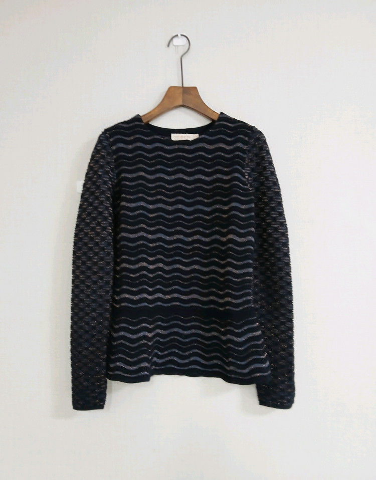 블라우스 느낌나는 물결 짜임 니트입니다 블랙 바탕에 여러가지 색상의 은은한 물결 무늬가 포인트로 들어가 있어 세련된 느낌을 줍니다 특히 반짝이는 골드사가 섞여 있어 과하지 않은 반짝임이 있어 얼굴빛이 화사해 보여요 사이즈XS(44-55) 가슴단면 42부터(신축성☆☆☆☆) 총길이60