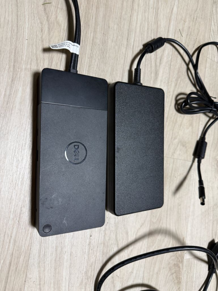 델 노크북 도킹스테이션이에요. 다양한 포트(USB, HDMI, 이더넷 등)가 있어서 노트북 확장용으로 정말 유용해요. 사용감은 있지만 정상 작동하는 상태입니다.