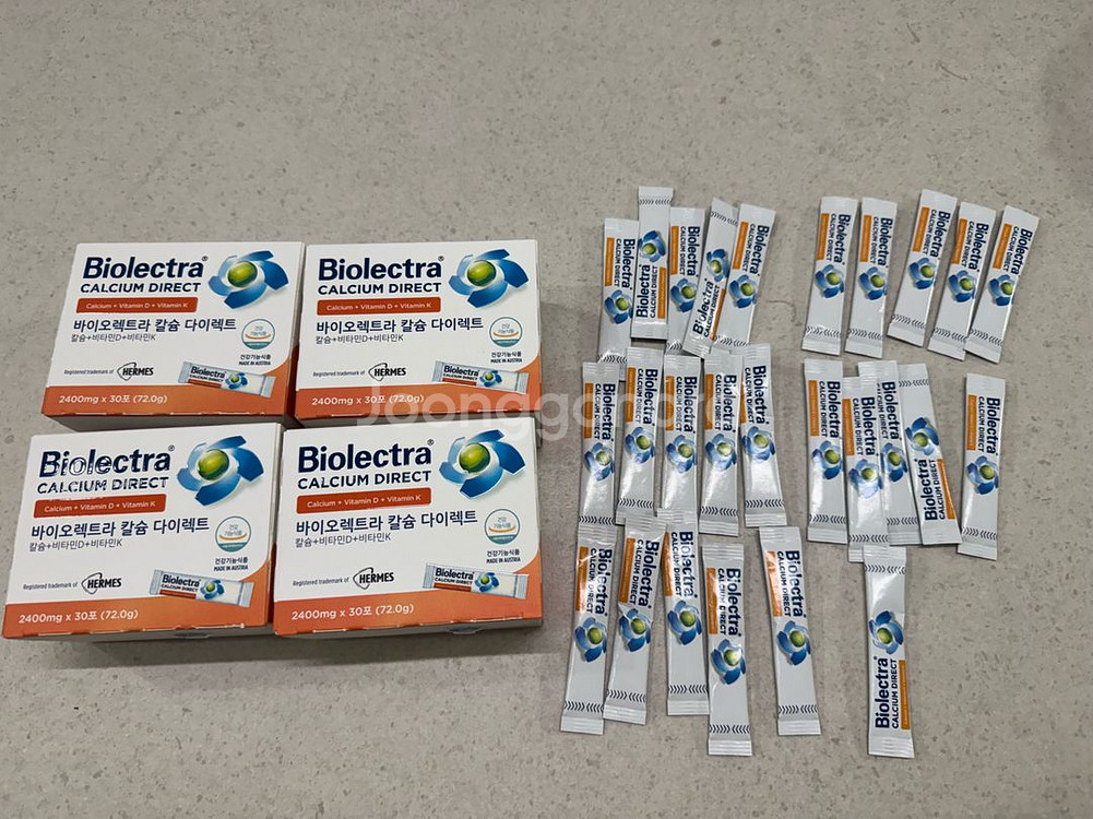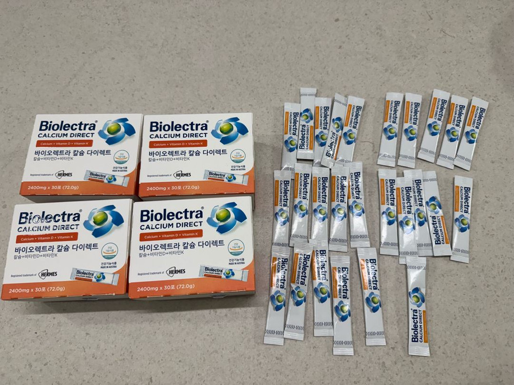 바이오렉트라 칼슘 다이렉트 30포 4박스와 낱개 26포 판매합니다 총 146포로 넉넉하게 섭취하실 수 있습니다 소비기한은 2028년 7월까지로 넉넉합니다 30포 한 박스에 가격이며, 일괄하시면 15만원입니다 뼈 건강에 도움을 줄 수 있는 식품으로, 칼슘과 비타민D, 비타민K가 함유되어 있습니다 물 없이 간편하게 섭취할 수 있는 다이렉트 제형으로, 언제 어디서든 편리하게 드실 수 있습니다