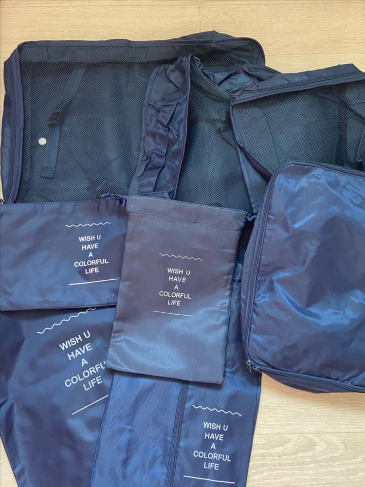 캐리어나 가방에 압축해서 넣을 수 있는 파우치 세트입니다 안 쓰는 파우치는 작게 접어서 보관할 수 있습니다 생활방수 돼있습니다 구성 버클형 메쉬파우치(대형) 버클형 메쉬파우치(중형) 메쉬파우치(소형) 시크릿파우치 스트랩파우치 미니파우치 신발파우치 총 7종입니다