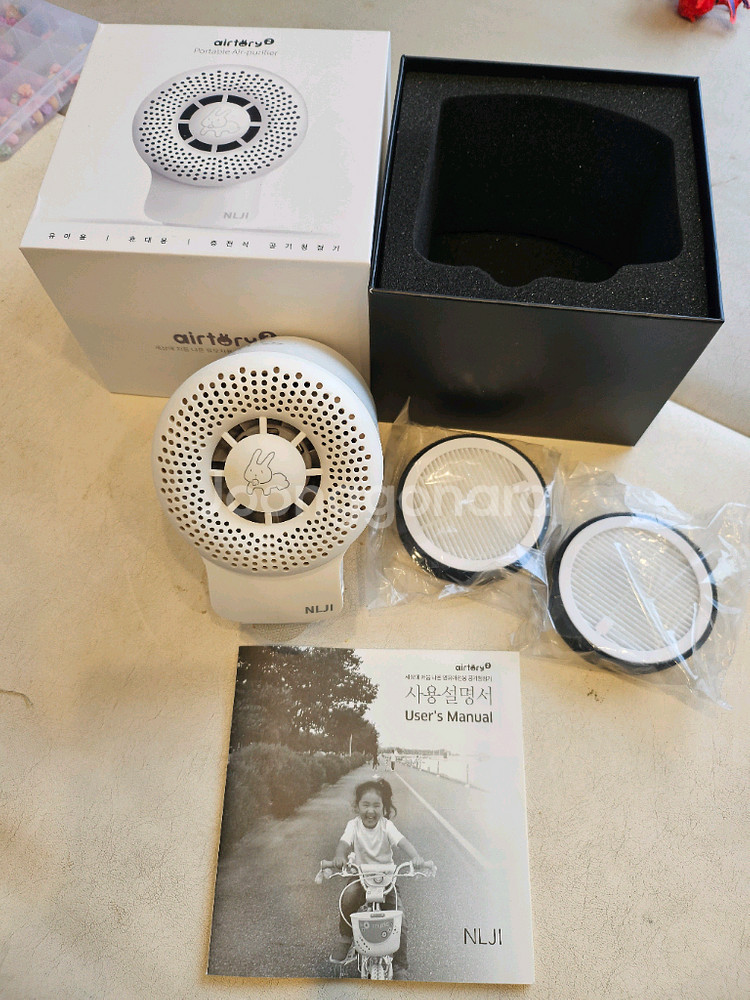 유모차와 차량에 사용할 수 있는 유아용 미니 공기청정기예요. 박스, 설명서 등 구성품이 모두 포함되어 있고 상태도 깨끗합니다. 미개봉 새상품 필터 2개도있어요.