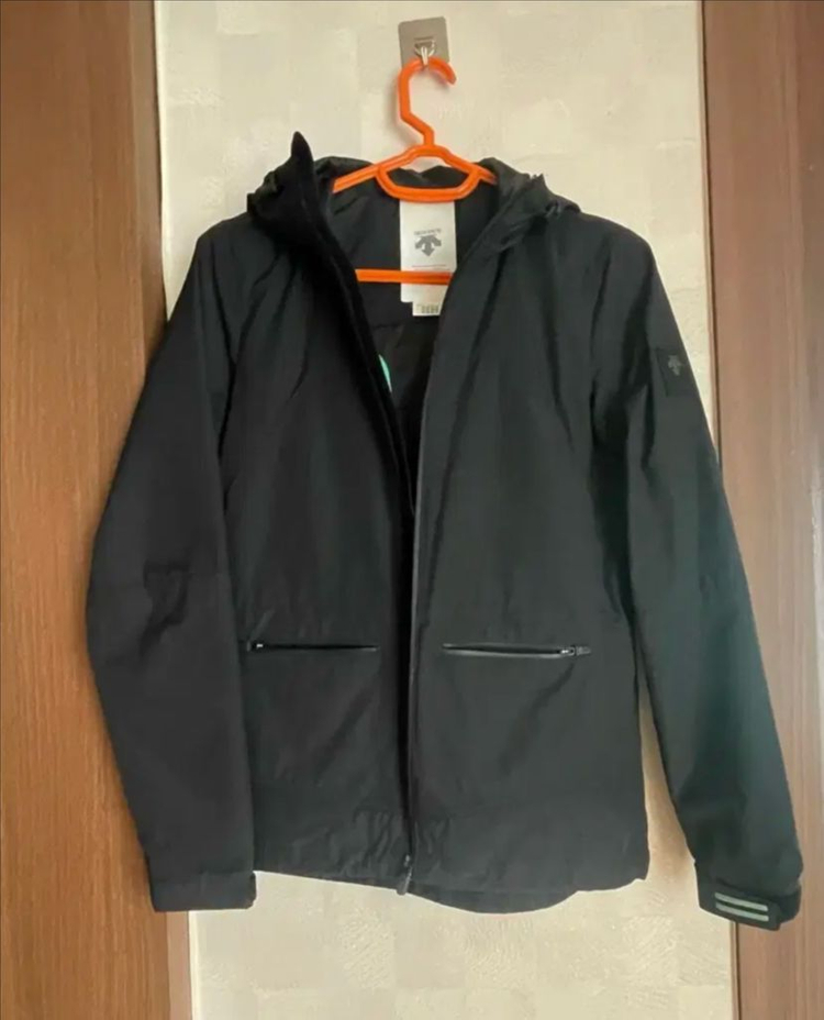 데상트 여성용 바람막이 자켓이에요. 블랙 컬러에 그린 포인트가 들어가 있고, 후드와 지퍼 포켓이 있어 실용적입니다. 상태 새옷.수준입니다. 가볍고 활동하기 좋아요. S사이즈 정가 30만원초반대 구매