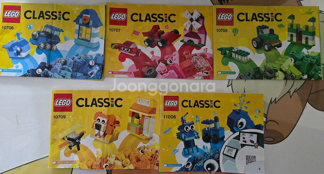 레고 클래식 색상별(빨강,노랑,초록,파랑)5세트일괄 판매힙니다 레고 10706, 10707, 10708, 10709, 11006 입니다 박스는 없고 설명서는 포함입니다 설명서는 테이핑, 구김등 사용감있으나 조립식별하는데는 문제없습니다 블럭은 아이가 놀던제품이랑 생활스크래치는 있으나 통에 보괂하고 많이 안써서(처음부터 피스많은 큰 제품을 만들었더니) 깨끗한 편입니다 구성품 누락은 없으나 11006(사진에 없는 하늘색 2×2브릭 2개 포함)에 하늘색 2개중 1개가 파란색으로 대체되었습니다(6,7번째 사진참조) 통은 따로 없고 세트별로 비닐에 분류해 놓았습니다 예민하신 분은 패스해주시고 꼭 하실분만 연락주세요 일반택배 포함이며 안심거래 원하시면 바로 결제해주시면 됩니다