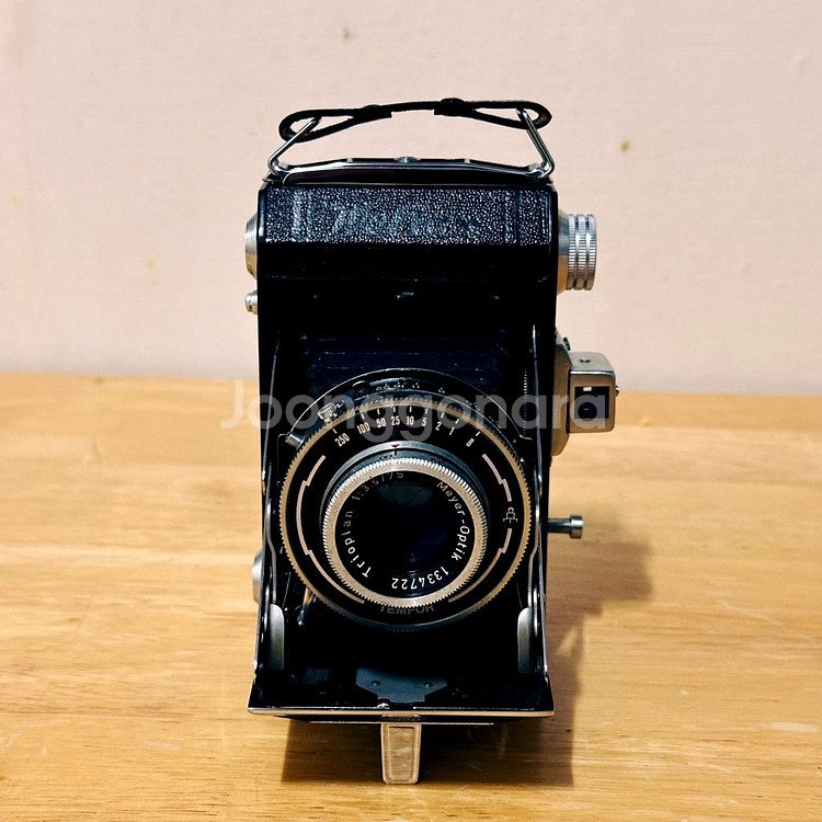 이 카메라는 독일 Welta사의 Weltax 중형 폴딩 카메라입니다. 요즘 흔히 보이는 TLR이나 일본 중형과는 다른 계보의 카메라로, 접으면 작고 펼치면 정통 중형 포맷을 사용하는 구조입니다. 기계식 폴딩 카메라 특유의 구조와 손맛이 분명한 모델입니다. 첨부한 사진은 이 카메라로 실제 촬영한 결과물입니다. 렌즈는 Meyer-Optik Görlitz Trioplan 75mm F3.5로, 개방에서는 부드럽고 깊이감 있는 톤이 나오고, 조이면 질감이 또렷하게 살아납니다. 나무 껍질의 결, 명암의 그라데이션, 전체적인 톤이 과하지 않게 정리되는 게 Trioplan 특유의 매력이라고 생각합니다. 흑백에서는 특히 중간톤이 예쁘게 이어집니다. 이 Weltax는 6×6과 4.5×6 포맷을 모두 지원하는 모델입니다. 내부 마스크가 포함되어 있어 포맷 전환이 가능하고, 촬영 스타일에 따라 선택할 수 있습니다. 중형 입문자에게도 활용도가 높은 이유입니다. 상태는 연식 대비 좋은 편입니다. 외관은 과한 찍힘 없이 관리된 상태이고, 벨로우즈는 찢어짐 없이 양호합니다. 필름실 내부도 깨끗하고 압판과 레일 상태도 정상입니다. 렌즈 역시 육안으로 보이는 큰 스크래치 없이 관리된 상태이며, 올드 렌즈 특성상 미세한 사용감 정도만 있습니다. 배터리 없이 사용하는 완전 기계식 카메라라 관리만 잘하면 앞으로도 계속 사용할 수 있는 모델이고, 실사용하면서도 충분히 결과물을 기대할 수 있는 카메라입니다. 단순히 진열용이 아니라, 실제로 찍는 재미가 있는 중형 폴딩 카메라라고 생각합니다.