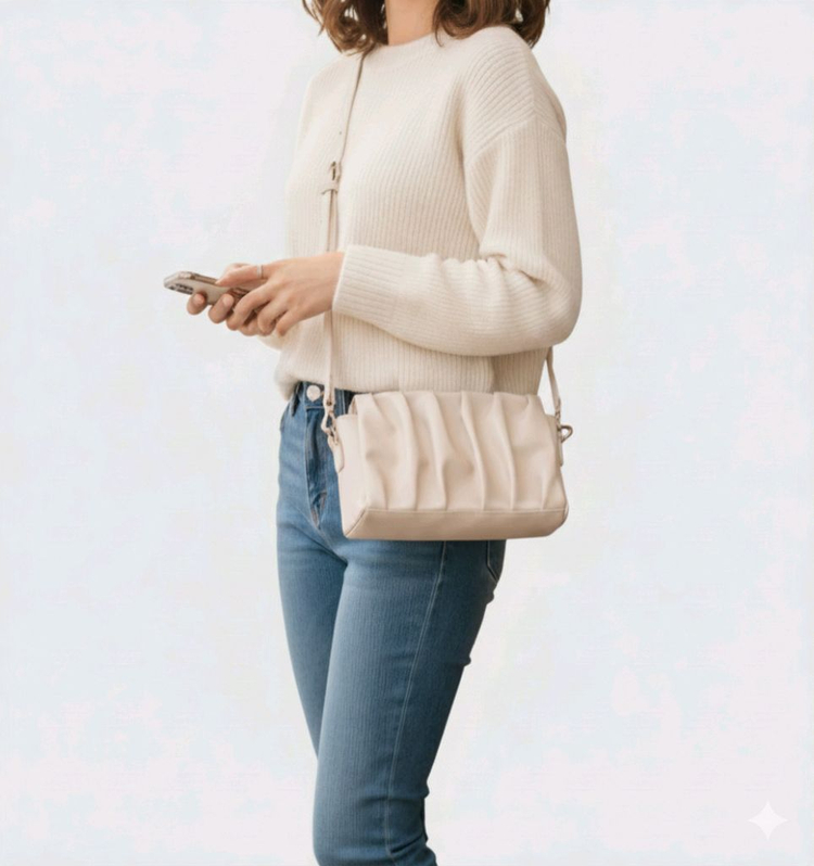 부드러운 아이보리 컬러의 숄더백입니다. 셔링 디테일과 꼬임 핸들이 포인트인 제품입니다. 데일리하게 들기 좋은 디자인으로, 어떤 룩에도 잘 어울립니다. 어깨끈 있어요. 상태아주양호 필요하신분 연락주세요 총지름25×세로15×폭7센티 정도 반값택배 2700원. 일반택배 4000원